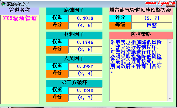 (2)通過匹配評價標準數(shù)據(jù)庫,實現(xiàn)對管道各風險評定因子的警度與風險分值的自動評定,再結(jié)合改進的肯特管道風險評價方法給出的權(quán)重分配,得出城市油氣管道防控預警分級評定情況,對油氣管道的預警防控工作和監(jiān)管應急工作具有一定的指導意義。