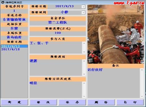 可方便地實現(xiàn)城市油氣管道主要性能參數(shù)的查閱、修改等功能,以管道為項目單位進行管理,主要包括管道基本信息、運行狀態(tài)信息、維修信息、事故信息四部分。維修信息窗口如圖4所示,事故管理窗口如圖 5所示。