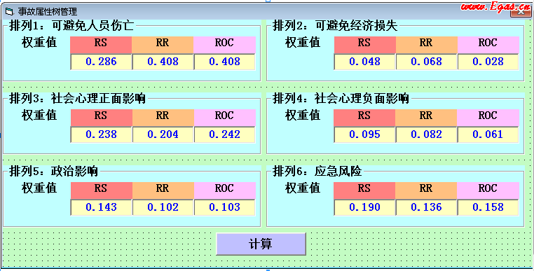 主要包括事故屬性值設(shè)定與屬性重要度排名區(qū)和應急方案總效用值計算區(qū)兩大部分,界面如圖 7所示。