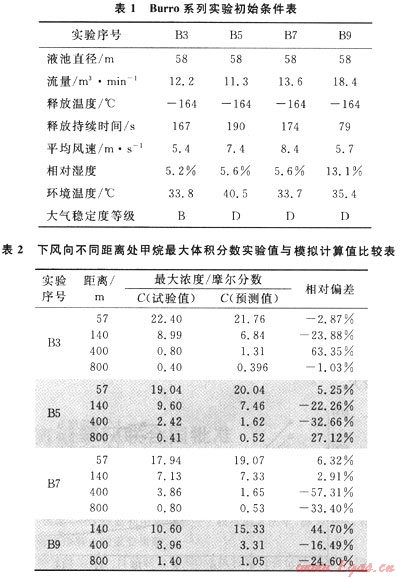 本文研究的數(shù)學(xué)模型通過Burro系列實驗[1,5]進(jìn)行驗證,Burro實驗在距離泄漏源下風(fēng)向57m、140m、400m、800m處分別測得天然氣的最大體積分?jǐn)?shù)值,該實驗共進(jìn)行了多組,本文對其中的3號、5號、7號和9號實驗進(jìn)行模擬,將實驗數(shù)據(jù)與模型計算結(jié)果對比,并進(jìn)行誤差分析,得出模型計算的平均相對偏差為24.28%。實驗的初始條件以及對比結(jié)果見表1、2。