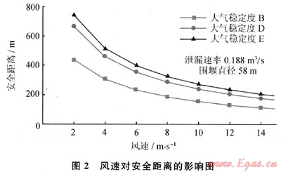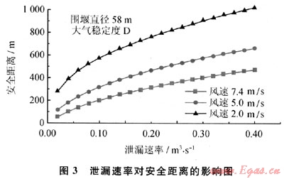 所建立的LNG泄漏氣體擴(kuò)散模型計算方法,經(jīng)過實驗驗證,其平均偏差為24.28%,并較準(zhǔn)確地體現(xiàn)了重氣擴(kuò)散過程中云團(tuán)內(nèi)部特性的變化規(guī)律。對于穩(wěn)態(tài)LNG氣體擴(kuò)散,當(dāng)風(fēng)速大于2m/s時,隨著風(fēng)速的增加,安全距離是逐漸減小的;對于較小風(fēng)速(小于2m/s)時,該穩(wěn)態(tài)模型將不再適用。泄漏速率增大使安全距離幾乎成比例增大,是影響安全距離最重要因素之一。對于給定的LNG泄漏率,圍堰尺寸變化對安全距離的影響會呈現(xiàn)出一個弱峰,之后安全距離會隨圍堰尺寸的增加而略有減小。