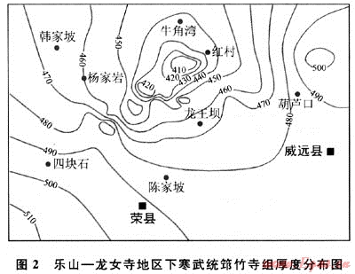 2) 下寒武統(tǒng)頁巖地層:分布面積大、范圍廣,可及整個揚子地臺區(qū),現(xiàn)今殘留面積約90×104km2。烴源巖厚度50~500m,其中厚度大于50m以上烴源巖面積約58×104km2。發(fā)育的層位相當(dāng)穩(wěn)定,以下寒武統(tǒng)筇竹寺組為主,與之相當(dāng)?shù)倪€有川黔鄂地區(qū)的牛蹄塘組或水井沱組、蘇浙皖地區(qū)的荷塘組、冷泉王組等。巖性主要為暗色頁巖、黑色碳質(zhì)頁巖、碳硅質(zhì)頁巖、黑色粉砂質(zhì)頁巖。上揚子地區(qū)的滇東、黔東北地區(qū)的頁巖地層普遍含磷,下?lián)P子地區(qū)夾石煤層。有機碳含量多在2.0%以上,最高可達(dá)13.64%,平均為2.77%。四川盆地下寒武統(tǒng)筇竹寺組井下樣品測試,有機碳含量平均為0.36%~5.03%,露頭樣品分析,有機碳含量平均為1.92%~2.35%(表3)。母質(zhì)類型以腐泥型干酪根為主,少量為腐殖型。干酪根δ13C為-29.82‰~-32.92‰(PDB),平均為-30.88‰,成烴潛力大。上揚子與下?lián)P子地區(qū)頁巖演化程度較高,Ro一般大于3%,最高可至5%及以上;中揚子地區(qū)頁巖的演化程度略低,Ro為2.0%~3.0%,部分還小于2.0%。目前在揚子區(qū)已發(fā)現(xiàn)的古油藏,如貴州甕安古油藏、麻江古油藏、銅仁古油藏、浙江泰山古油藏、湘西南山坪古油藏、紹興坡塘古油藏等,油源均來自于下寒武統(tǒng)烴源巖。下寒武統(tǒng)烴源巖的分布范圍、厚度及有機碳含量在區(qū)域上基本穩(wěn)定,差異不大。上揚子地區(qū)的四川盆地南部地區(qū)烴源巖厚度為200~400m,有機碳含量0.5%~5.00;至黔北、五陵、湘鄂西地區(qū)烴源巖厚度為50~500m,有機碳含量為0.5%~3.0%;江南隆起北緣生油區(qū)烴源巖厚度為200~400m,有機碳含量為0.5%~2%,至下?lián)P子地區(qū)西北部生油區(qū)烴源巖厚度是50~120m,有機碳含量為0.5%~5%;皖南、蘇南生油區(qū)烴源巖相對不發(fā)育,厚度在50m左右,有機碳含量為0.50~4%。下寒武統(tǒng)烴源巖生烴強度較高,部分地區(qū)為(100~200)×108m3/km2。四川盆地下寒武統(tǒng)筇竹寺組黑色頁巖厚74~400m,有機碳含量0.5%~4.1%,Ro為1.83%~3.26%。樂山-龍女寺地區(qū)下寒武統(tǒng)筇竹寺組發(fā)育最好(圖2),為一套淺水陸棚環(huán)境下沉積的黑色、深灰色頁巖,厚度一般為100~400m,資陽-威遠(yuǎn)地區(qū)較厚,達(dá)250~350m,由古隆起頂部向南部坳陷區(qū)厚度大幅度增加。