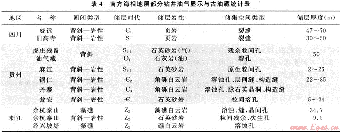 5) 鉆井天然氣顯示:不完全統(tǒng)計,早期在常規(guī)油氣勘探過程中,在100口余鉆井中見到天然氣顯示或露頭發(fā)現(xiàn)古油藏及頁巖氣顯示(表4)。據(jù)四川盆地威遠(yuǎn)地區(qū)36口鉆井統(tǒng)計,筇竹寺組頁巖有30口井發(fā)現(xiàn)氣顯示,志留系龍馬溪組13口井中有10口見氣顯示。威遠(yuǎn)地區(qū)的威5、威9、威18、威22和威28等井下寒武統(tǒng)泥頁巖均見氣侵井涌和井噴,其中威5井下寒武統(tǒng)筇竹寺組2795~2798m頁巖井段發(fā)現(xiàn)氣侵與井噴,中途測試日產(chǎn)氣2.46×104m3,酸化后日產(chǎn)氣1.35×104m3。川東南地區(qū)陽高寺構(gòu)造帶的陽深2、宮深1、付深1、陽63、陽9、太15和隆32等井在下志留統(tǒng)龍馬溪組多處發(fā)現(xiàn)氣顯示,其中陽63井下志留統(tǒng)龍馬溪組3505~3518.5m黑色頁巖段,酸化后獲日產(chǎn)氣3500m3,隆32井下志留統(tǒng)龍馬溪組3164.2~3 175.2m黑色碳質(zhì)頁巖段獲日產(chǎn)氣1948m3。另外,20世紀(jì)70年代中期在貴州大方地區(qū)鉆探的方深1井,在下寒武統(tǒng)牛蹄塘組也發(fā)現(xiàn)良好氣顯示。該井下寒武統(tǒng)牛蹄塘組鉆遇井深1686~1785m,厚99m,巖性上部為一套深灰色含碳質(zhì)粉、細(xì)砂巖與碳質(zhì)頁巖互層,中-下部為黑色碳質(zhì)頁巖。有機碳含量2.97%~8.02%;氯仿瀝青“A”含量0.087%~0.11%,成熟度為高-過成熟。鉆井中,在1723.4~1726.7m井段見氣測異常,泥漿見雨狀氣泡,含氣38%,點燃呈藍(lán)色火焰,下伏震旦系全井段氣測異常,電測解釋6個含氣層、3個可能含氣層。