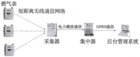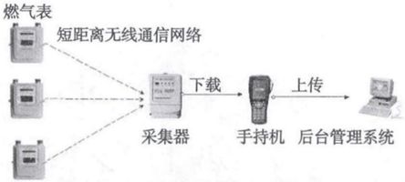 無線燃?xì)獗硗ㄟ^自身攜帶的無線通信模塊與采集器實(shí)現(xiàn)無線通信,采集器定期主動(dòng)采集燃?xì)獗淼臄?shù)據(jù)并儲(chǔ)存,工作人員通過手持機(jī)與采集器通信將表中的數(shù)據(jù)下載到手持機(jī)中。此種抄表系統(tǒng)中的通信方式均為短距離通訊網(wǎng)絡(luò)。該技術(shù)僅僅將有線抄表技術(shù)更換成無線通訊,依然需要工作人員定期將數(shù)據(jù)下載到手持機(jī)中,比較落后。