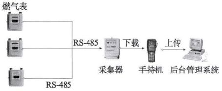 有線抄表系統(tǒng)主要由燃?xì)獗?、采集器和手持機(jī)構(gòu)成,其原理如圖2所示。燃?xì)獗硗ㄟ^通信總線與采集器相連,采集器定期采集燃?xì)獗頂?shù)據(jù)并存儲(chǔ)于芯片中。工作人員通過手持機(jī)讀取采集器中所存儲(chǔ)的燃?xì)獗頂?shù)據(jù)并將其上傳到燃?xì)馄髽I(yè)后臺(tái)管理系統(tǒng)。