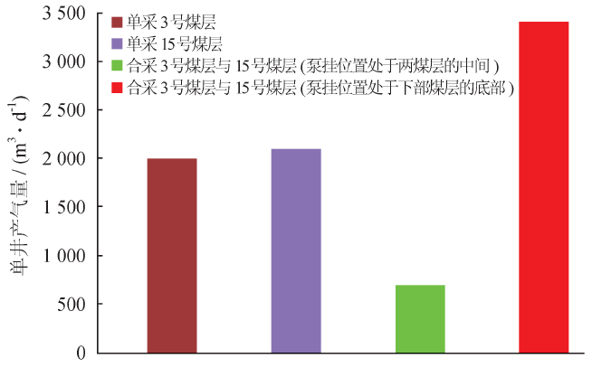 圖1 沁水盆地3 號(hào)、15 號(hào)煤層合采與單采情況下單井產(chǎn)氣量對(duì)比圖