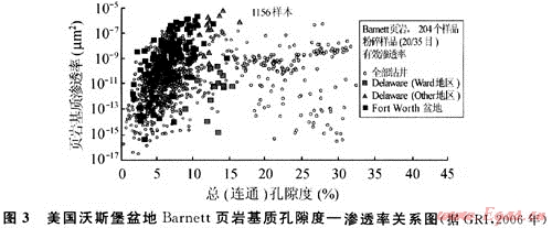 4) 頁(yè)巖氣藏儲(chǔ)層具典型的低孔低滲物性特征,頁(yè)巖產(chǎn)層厚度一般為15~100m,孔隙度一般為4%~6%,滲透率小于0.001×10-3μm2(見(jiàn)圖3)。處于斷裂帶或裂縫發(fā)育帶的頁(yè)巖儲(chǔ)層滲透率可以增加,孔隙度最高可達(dá)11%,滲透率可達(dá)1×10-3μm2左右[1]。據(jù)美國(guó)主要頁(yè)巖氣產(chǎn)層儲(chǔ)層物性統(tǒng)計(jì),孔隙度為4.22%~6.51%,滲透率為40.9×10-6μm2。