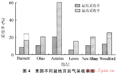 據(jù)美國(guó)5個(gè)主要頁(yè)巖氣產(chǎn)氣盆地的統(tǒng)計(jì),頁(yè)巖氣藏的采收率變化范圍為5%~60%(見(jiàn)圖4)。如埋藏較淺、地層壓力較低、有機(jī)質(zhì)豐度較高、吸附氣含量較高的Antrim頁(yè)巖氣藏的采收率可達(dá)60%;而埋藏較深、地層壓力較高、吸附氣所占比例相對(duì)較低的Barnett頁(yè)巖氣藏的采收率早期為7%~8%,隨著水平井和壓裂技術(shù)的進(jìn)步,目前的采收率達(dá)到16%,預(yù)計(jì)最終可達(dá)25%左右。