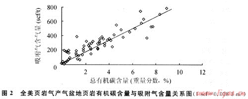 2) 頁(yè)巖氣主要由吸附氣和游離氣兩部分組成。其中基質(zhì)孔隙和裂縫中的游離氣的儲(chǔ)集方式與常規(guī)天然氣儲(chǔ)層相似;有機(jī)質(zhì)與黏土顆粒表面的吸附氣的儲(chǔ)集方式與煤層氣相似。不同地質(zhì)條件下游離氣與吸附氣的相對(duì)比例有很大差別[2]。影響游離氣量大小的主要因素是頁(yè)巖基質(zhì)孔隙的大小和天然裂縫的發(fā)育程度,二者為正相關(guān)關(guān)系;影響吸附氣多寡的關(guān)鍵因素是有機(jī)碳含量的高低,二者同樣具正相關(guān)性(見(jiàn)圖2)。
