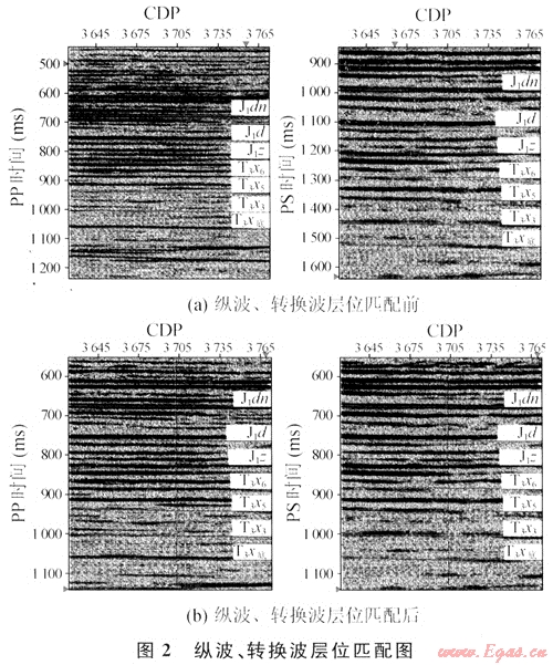 在井旁標(biāo)定層位后,就可以展開(kāi)整個(gè)剖面的對(duì)比工作,這與常規(guī)解釋相同。層位解釋完成后,需要做多波解釋的特殊解釋工作——層位匹配。由于縱波、橫波在同一地層介質(zhì)中的傳播速度不同,因此同一反射在時(shí)間剖面上縱波和轉(zhuǎn)換波的時(shí)間有很大差異,為了更好對(duì)縱波、轉(zhuǎn)換波進(jìn)行聯(lián)合地質(zhì)目標(biāo)體解釋?zhuān)殞?duì)縱波橫波進(jìn)行層位匹配。層位匹配是對(duì)縱、橫波地震響應(yīng)較為系統(tǒng)的一個(gè)認(rèn)識(shí)過(guò)程。圖2是縱波、轉(zhuǎn)換波層位匹配前后的時(shí)間剖面,可以看出,經(jīng)匹配后縱波、轉(zhuǎn)換波層位得以一一對(duì)應(yīng)。