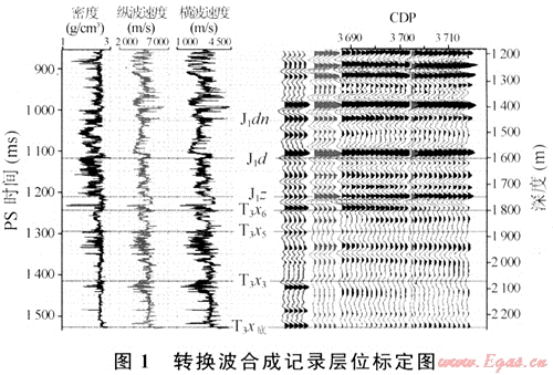 多波解釋首當(dāng)其沖的問(wèn)題便是轉(zhuǎn)換波的地質(zhì)層位標(biāo)定。它是多分量解釋最為關(guān)鍵的一環(huán),也是國(guó)內(nèi)外公認(rèn)的一個(gè)難點(diǎn)。圖1是利用GeoMountain解釋工程師軟件在縱波地質(zhì)層位標(biāo)定的基礎(chǔ)上對(duì)GA2井進(jìn)行轉(zhuǎn)換波合成記錄地質(zhì)層位的標(biāo)定結(jié)果。