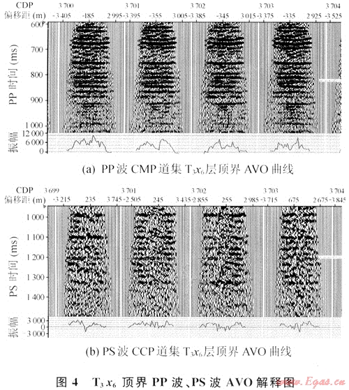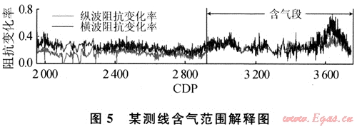 通過(guò)匹配的PP波和PS波剖面就得到了目的層段的PP波和PS波旅行時(shí)的對(duì)應(yīng)關(guān)系,這是進(jìn)行多波聯(lián)合反演的重要基礎(chǔ)。完成多波層位匹配方可進(jìn)行多波聯(lián)合反演。多波聯(lián)合反演采用目的層位的PP波和PS波AVO效應(yīng)來(lái)求取目的層位的彈性參數(shù)信息。因此首先拾取出目的層的AVO曲線(圖4)。為了將AVO曲線轉(zhuǎn)換為AVA曲線,利用PP波和PS波速度譜建立PP波和PS波的速度場(chǎng),對(duì)速度比進(jìn)行估計(jì)。經(jīng)AVO正演方法對(duì)地震數(shù)據(jù)能量進(jìn)行調(diào)整,最后由目的層頂界面PP波和PS波的AVO曲線反演了蓋層與儲(chǔ)層的縱波和橫波的阻抗變化率(圖5)。綜合工區(qū)井資料、地質(zhì)資料進(jìn)行分析,再由橫向上的阻抗變化率圖可見(jiàn),在CDP2890附近特征明顯變化,左邊的阻抗變化率低于右邊的,但提高變化率較為明顯反映了目標(biāo)儲(chǔ)層的含氣范圍,為此套儲(chǔ)層的開(kāi)發(fā)提供了依據(jù)。