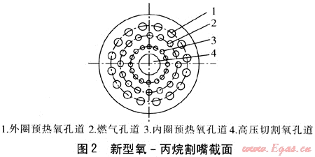 由于不同燃氣具有不同的性質(zhì),若在原來的氧-乙炔割嘴上直接使用丙烷來進行氣割,就會有火焰分散無力、氣割速度緩慢、點火困難、不易調(diào)節(jié)的缺點。因此必須設計專用的氧-丙烷氣割割嘴才能滿足氣割要求。丙烷的熱值比乙炔高,丙烷的燃燒溫度比乙炔的燃燒溫度低。需要重新調(diào)整可燃氣體與氧氣的比例,降低丙烷-氧氣混合氣體的噴出速度,才能保證良好的燃燒。