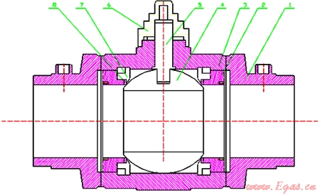 PE球閥是由塑料配件組成的全封閉式結(jié)構(gòu),由接管座1,閥座2,閥殼體3,閥球4,閥桿5,扳手6,擋圈7,密封圈8組成。其中接管座1,閥座2,閥殼體3采用與管體相同的PE材料制成,閥球4,閥桿5,扳手6,擋圈7用比主體材料硬度、強(qiáng)度更高的其他塑料制成。通過閥座2,擋圈7來固定密封圈8,并構(gòu)成閥座組合體,分布在閥球8的兩側(cè),閥桿環(huán)形凹槽上的密封圈和扳手內(nèi)腔上的密封圈保證了PE球閥在閥桿5、扳手6處的密封性,而閥殼體3、閥座2與接管座1又通過熱熔方式組合成一整體,保證了連接處的嚴(yán)密性,因此PE球閥在通常情況下不會(huì)產(chǎn)生外泄漏現(xiàn)象。