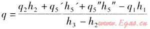 式中q5”、h5”與待求量q相關(guān),但由于q5”很小,僅約占q5(q5=q5’+q5”)的0.3%,q5”h5”也僅約占(q2h2-q1h1)的0.4%,將其略去,上式變成: