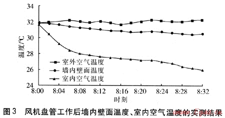 2006年8月7日對風(fēng)機(jī)盤管工作后墻內(nèi)壁面溫度、室內(nèi)空氣溫度的實(shí)測結(jié)果見圖3。由圖3可知,墻內(nèi)壁面實(shí)測初始溫度為31.8℃,實(shí)測室內(nèi)初始空氣溫度為31.6℃。隨著風(fēng)機(jī)盤管的開啟,墻內(nèi)壁面溫度平緩下降,30min后降至30.5℃,由于時間較短,可以近似認(rèn)為墻內(nèi)壁面溫度保持不變。風(fēng)機(jī)盤管工作30min后,室內(nèi)空氣溫度由31.6℃降至26℃,風(fēng)機(jī)盤管工作時間與計(jì)算結(jié)果(18~23min)相差不大。