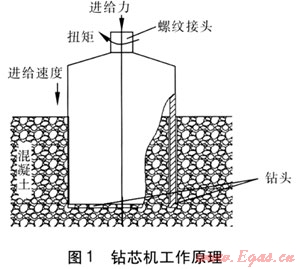 鉆芯機(jī)是以表鑲金剛石切割筒式高性能鉆頭旋轉(zhuǎn)切割鉆進(jìn)的機(jī)械,工作原理見圖1。機(jī)體通過(guò)軸的傳遞給切割筒式鉆頭施加一定的壓力和扭矩,鉆頭旋轉(zhuǎn)向下切割路面,使路面出現(xiàn)一個(gè)圓形切割縫和圓柱形芯塊,鉆到底后將芯塊提取出來(lái),便可對(duì)埋在正下方的管道進(jìn)行施工。在鉆進(jìn)過(guò)程中,以水作為鉆頭的冷卻液,這些水還可以清洗孔底,具有排屑、潤(rùn)滑鉆頭的作用。