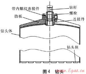 鉆頭為表鑲金剛石切割筒式高性能鉆頭,是鉆芯機(jī)直接切割混凝土芯塊的刀具。切割鉆進(jìn)混凝土的效率、鉆進(jìn)速度及鉆頭壽命,在很大程度上與鉆頭結(jié)構(gòu)形式及材料狀況有關(guān),因此鉆頭設(shè)計(jì)非常重要。從鉆芯機(jī)工作時(shí)的受力情況來(lái)看,鉆頭承受著很大的軸向載荷及摩擦力,因此,要求鉆頭體有較高的表面硬度、較好的耐磨性及足夠的剛度,不易發(fā)生變形,按此要求設(shè)計(jì)的鉆頭見圖4,其中,鉆頭塊含金剛石和胎體。
