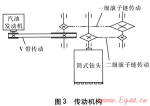 傳動(dòng)機(jī)構(gòu)采用V帶傳動(dòng)和兩級(jí)滾子鏈傳動(dòng),通過(guò)多級(jí)減速傳動(dòng)輸出,帶動(dòng)筒式鉆頭旋轉(zhuǎn)切割,傳動(dòng)機(jī)構(gòu)見圖3。