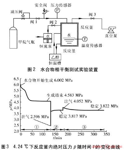 在恒定的反應(yīng)釜容積下,保持實(shí)驗(yàn)溫度不變,使水過量,充入甲烷,使反應(yīng)釜內(nèi)初始壓力高于實(shí)驗(yàn)溫度所對應(yīng)的平衡壓力。當(dāng)有水合物生成,且反應(yīng)釜內(nèi)壓力不再下降時,穩(wěn)定1~3h之后,將反應(yīng)釜內(nèi)壓力泄至實(shí)驗(yàn)溫度對應(yīng)的平衡壓力以下,此時水合物大量分解,壓力開始上升。當(dāng)壓力不再上升時,穩(wěn)定1~3h,再充入甲烷,升壓至實(shí)驗(yàn)溫度對應(yīng)的平衡壓力以上,使水合物再次生成。如此反復(fù)幾次,取其值最接近的升壓后的壓力值和降壓后的壓力值的平均值,作為該溫度下的水合物相平衡壓力值。