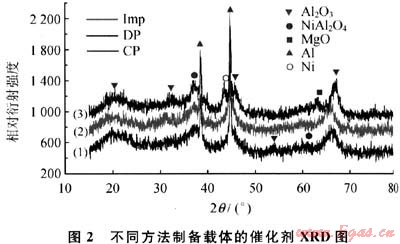 圖2為不同方法制備4%MgO-Al203載體制成催化劑的XRD譜圖。通過(guò)與標(biāo)準(zhǔn)譜圖進(jìn)行對(duì)比可以得知這3種催化劑中都存在Ni、Al、MgO、Al203、NiAl2O4相,其中,當(dāng)2θ為36°處存在NiAl2O4尖晶石的衍射峰,共沉淀法制備的載體催化劑的NiAl2O4衍射峰最弱,而其他兩種方法NiAl2O4的衍射峰逐漸增強(qiáng),說(shuō)明Ni與Al2O3的相互作用較強(qiáng),使活性中心Ni的含量較少,進(jìn)而影響其催化劑的催化活性。
