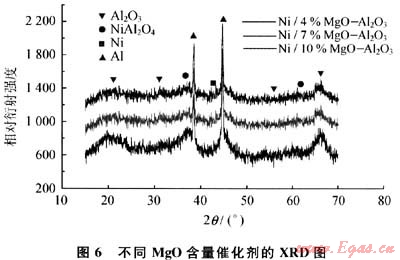 圖6為不同MgO含量的載體催化劑的XRD譜圖,通過(guò)與標(biāo)準(zhǔn)譜圖對(duì)比可以看出,在2口為36°和62°兩處出現(xiàn)NiAl2O4尖晶石的衍射峰,4%MgO-Al203載體曲線中NiAl2O4的衍射峰很弱,但隨著MgO加入量的增加,NiAl2O4的衍射峰逐漸增強(qiáng),說(shuō)明Ni與Al2O3的相互作用增強(qiáng),活性中心Ni逐漸減少,而且4%MgO-Al203載體的曲線比較散漫,表明粒徑分布較為均勻,使得催化活性較好。