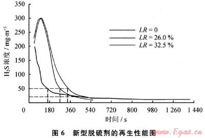 我國GB 17820一1999《天然氣》規(guī)定,城市管道天然氣中硫化氫含量標(biāo)準(zhǔn)為:一類天然氣中硫化氫含量不大于6mg/m3,二類天然氣中硫化氫含量不大于20mg/m3,三類天然氣中硫化氫含量小于460mg/m3。而GB 18047—2000《車用壓縮天然氣》規(guī)定,車用壓縮天然氣中硫化氫含量不大于15mg/m3。由圖5可以看出,LR>14.3%的脫硫劑,硫化氫穿透時間長于300s,即300s內(nèi)產(chǎn)品氣中不含硫化氫,符合一類城市管道天然氣和車用天然氣用氣要求。