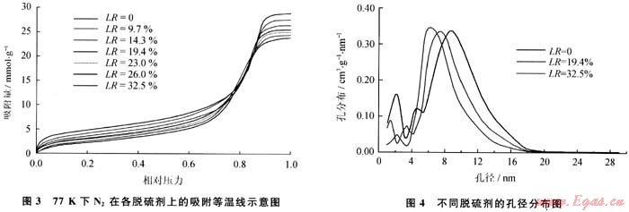 由表1看出,新脫硫劑的比表面積、孔容和孔徑都隨吸收劑涂漬比的增加而減小,同時由圖4可以看出,隨吸收劑涂漬比增加微孔大量減少,LR為32.5%的脫硫劑,微孔已經(jīng)基本消失。