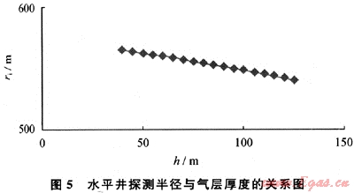 給定氣層厚度40~125m,其他參數(shù)同前,由式(8)得出探測(cè)半徑與氣層厚度的關(guān)系(圖5)??梢钥闯觯簹鈱雍穸仍龃螅綔y(cè)半徑減小,但減小的幅度很小。此即說(shuō)明滲流截面積越大,壓力波向地層推進(jìn)越慢。