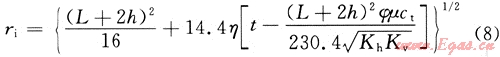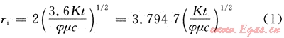 石油工業(yè)中國(guó)際上對(duì)于探測(cè)半徑的定義為:在某一確定的瞬時(shí),給井中施加一個(gè)壓力脈沖,對(duì)該脈沖響應(yīng)達(dá)到最大值的位置就稱(chēng)為探測(cè)半徑。在標(biāo)準(zhǔn)單位制式下,探測(cè)半徑表示為[1]: