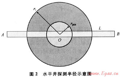 ;利用產(chǎn)量等值原則,將線(xiàn)性水平井段簡(jiǎn)化為擬圓形坑道,應(yīng)該看到中心圓形半徑為rpc=L/4,由于生產(chǎn)坑道空間自身的圓形半徑為h/2。因此圓形坑道的外緣半徑為rpce=(L/4)+(h/2)。從供給邊境至圓形坑道外緣的流動(dòng)為平面徑向流,從擬生產(chǎn)坑道的外緣半徑至生產(chǎn)井底的流動(dòng)為氣層厚度h的空間高度上、垂直并圍繞水平井段的平面徑向流,半徑為氣層高度之半(h/2)。3 水平井探測(cè)半徑的概念
