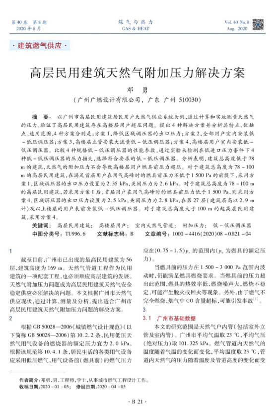 截至目前,廣州市已出現(xiàn)的最高民用建筑為56層,建筑高度為169 m。天然氣管道工程作為民用建筑的一項(xiàng)配套工程,也必須順應(yīng)高層建筑的發(fā)展。天然氣附加壓力問(wèn)題成為高層民用建筑天然氣安全穩(wěn)定供應(yīng)必須解決的問(wèn)題。本文根據(jù)廣州市天然氣供應(yīng)現(xiàn)狀,通過(guò)計(jì)算、測(cè)量及分析,提出適合廣州市高層民用建筑天然氣附加壓力問(wèn)題的解決方案。