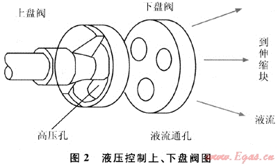 調(diào)制式旋轉(zhuǎn)導(dǎo)向鉆井工具(MRST)屬于推靠式旋轉(zhuǎn)導(dǎo)向鉆井工具(圖1)。由于其鉆柱與井壁之間不存在靜止點(diǎn),因此,在鉆井過(guò)程中更可體現(xiàn)旋轉(zhuǎn)鉆井的優(yōu)越性[1]。調(diào)制式旋轉(zhuǎn)導(dǎo)向鉆井系統(tǒng)導(dǎo)向力的大小和方向主要是由穩(wěn)定平臺(tái)控制的。當(dāng)需要最大導(dǎo)向力時(shí),穩(wěn)定平臺(tái)控制軸就帶動(dòng)上盤(pán)閥旋轉(zhuǎn),使上盤(pán)閥穩(wěn)定在預(yù)定方向,控制上盤(pán)閥高壓孔方向恒定。在鉆柱旋轉(zhuǎn)過(guò)程中,每個(gè)“巴掌”依次在該方向附近伸出拍打井壁,導(dǎo)向機(jī)構(gòu)對(duì)井壁的作用力就是這些拍打力的合力。這個(gè)合力的反力就是鉆柱受到的導(dǎo)向力,方向沿著上盤(pán)閥預(yù)定方向的反方向。當(dāng)不需要導(dǎo)向時(shí),穩(wěn)定平臺(tái)帶動(dòng)上盤(pán)閥以和鉆柱具有不同的某一轉(zhuǎn)速勻速轉(zhuǎn)動(dòng),這時(shí)“巴掌”均勻拍打井壁四周,導(dǎo)向工具可控制的液壓導(dǎo)向力的合力就等于零,此時(shí)導(dǎo)向工具呈中性工作狀態(tài),達(dá)到穩(wěn)斜效果。MRST液壓控制閥采用上、下盤(pán)閥結(jié)構(gòu),上盤(pán)閥與穩(wěn)定平臺(tái)控制軸相連接,它只有一個(gè)弧形長(zhǎng)孔形狀的高壓閥孔。下盤(pán)閥與鉆柱本體連接,隨MRST外殼及鉆柱一起旋轉(zhuǎn),它有3個(gè)互成120°圓心角的等直徑低壓孔(泄流孔),見(jiàn)圖2。