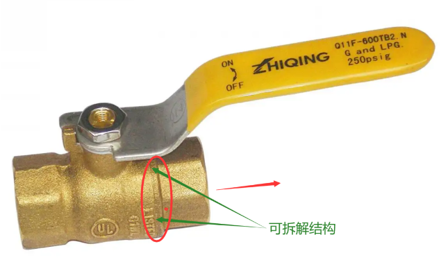 如果上述的球閥安裝方向分正反的話,那這種常見的球閥我想是不是也該按紅色箭頭安裝方向進行安裝。因為右側(cè)也是一個可拆解的結(jié)構(gòu)(猜測很難拆解,但維修過閥門的都知道,另外閥門本體此處泄漏的可能性有多少?)。