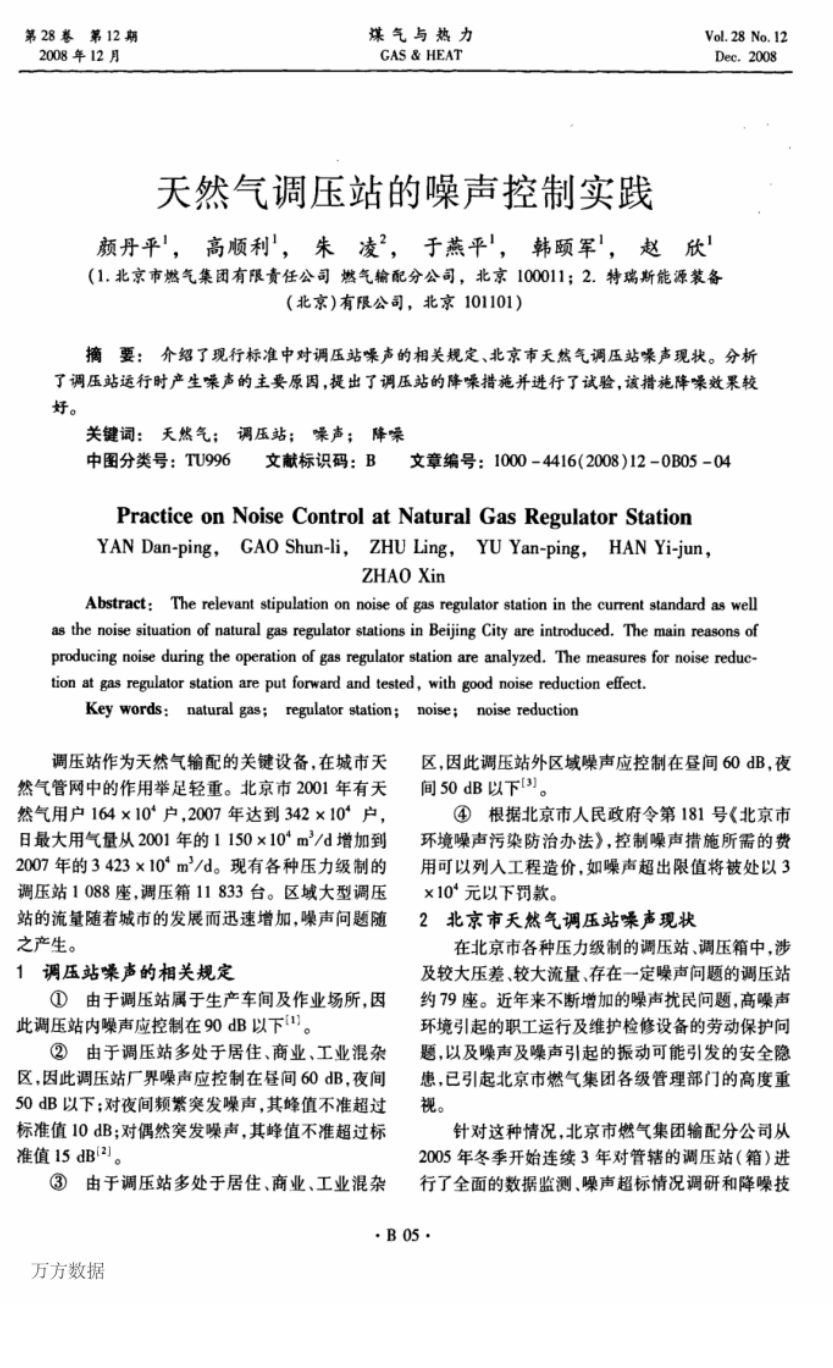 摘要:介紹了現(xiàn)行標(biāo)準(zhǔn)中對調(diào)壓站噪聲的相關(guān)規(guī)定,北京市夭然氣調(diào)壓站噪聲現(xiàn)狀。分析了調(diào)壓站運(yùn)行時(shí)產(chǎn)生噪聲的主要原因,提出了調(diào)壓站的降噪措施并進(jìn)行了試驗(yàn),該措施降噪效果較好。