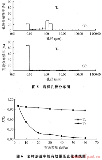 T6(K0=12.62×10-3μm2,φ0=14.8%)和T7(K0μm2,φ0=3.7%)是孔滲參數(shù)差=0.079×10-3異較大的兩塊巖樣。從巖樣的孔徑分布圖與覆壓滲透率變化曲線(圖5、6)可以看出:對于低孔低滲透巖樣,小孔徑占了絕大多數(shù),在覆壓實驗中,小孔道一旦受到壓縮發(fā)生塑性變形就會嚴重喪失滲流功能,導致巖樣的滲透率大幅下降,表現(xiàn)出較強的應力敏感性。