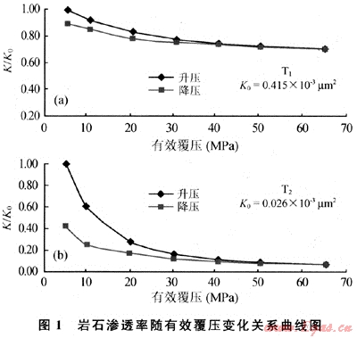 1是采用CMS300測得的低滲透巖石滲透率與有效覆壓關系曲線。從圖1可看出:①巖樣初始滲透率(K0越低,滲透率在有效覆壓增加的過程中的下降幅度越大;②滲透率在有效覆壓增大的初始階段下降幅度最大,覆壓降低后滲透率不能完全恢復,說明巖樣在實驗過程中發(fā)生了微量的軟塑性變形。)