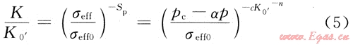 大量實驗數(shù)據(jù)表明:與指數(shù)式相比,這種表達式與實驗數(shù)據(jù)有更好的相關性(多數(shù)相關系數(shù)超過0.99)。目前常規(guī)巖樣孔滲都是在地面低圍壓條件下所測得,利用式(5)一方面可將巖樣常規(guī)滲透率轉換成原始儲層條件下的滲透率,對原始儲層物性作出正確評價,另一方面可以計算儲層滲透率在開發(fā)過程中的動態(tài)變化規(guī)律,具有實際的工程應用價值。