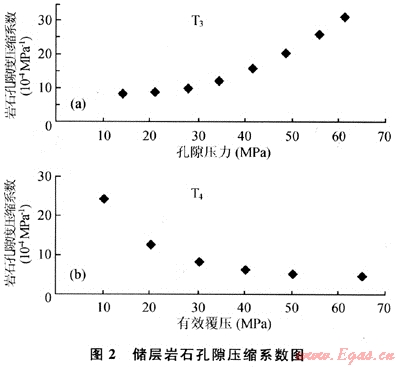 2是采用增加圍壓與降低孔隙壓力兩種方法所測得的巖石孔隙壓縮系數(shù)與應力的關系曲線。從圖2中可以看出是變化值而非固定值,初始值很高,隨著圍壓增大、孔隙壓力減小,下降很快,圍壓、孔隙壓力達到一定值后,變化不大,保持穩(wěn)定,這表明在實驗過程中巖石發(fā)生的并非理想的線彈性變形。