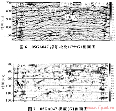 通過實(shí)際資料的AVO屬性剖面反演與鉆井結(jié)果的綜合分析對比,認(rèn)識到在上述5種AVO屬性剖面中,擬泊松比剖面(P+G)和梯度剖面(G)能很好地指示須六段儲層的含氣性,含氣處都表現(xiàn)為強(qiáng)振幅,且反演結(jié)果與實(shí)際鉆井結(jié)果非常吻合(見圖6、7),該方法是AVO疊前道集分析和近遠(yuǎn)道疊加剖面對比氣層預(yù)測方法的有效補(bǔ)充,可以進(jìn)一步提高須六段氣層的預(yù)測精度。