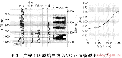 圖2為廣安115井原始曲線AVO正演模型,目的層為須六段1828~1840m、1843~1953.5m為工業(yè)氣層,左圖分別是測井實(shí)測的密度、橫波速度、泊松比和聲波4條曲線和采用Zoepprittz方程計(jì)算出的中心點(diǎn)道集,右圖中虛線是合成道集上拾取的反射振幅隨炮檢距的變化關(guān)系,從圖中可以看出,須六段氣層的AVO響應(yīng)特征非常明顯,在共中心點(diǎn)道集上氣層的反射振幅隨炮檢距的增大明顯增強(qiáng)。