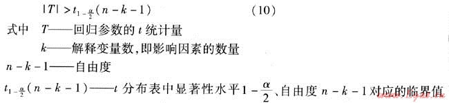 對求得的回歸參數(shù)進(jìn)行t檢驗,若回歸參數(shù)的t統(tǒng)計量滿足式(10),則認(rèn)為此回歸參數(shù)對應(yīng)的項目對居民生活年燃?xì)庀牧縬有顯著影響,否則認(rèn)為影響不顯著。