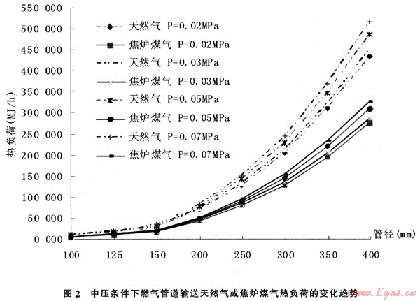 燃?xì)夤艿肋M(jìn)口壓力分別為0.02MPa、0.03MPa、0.05MPa和0.07MPa時(shí),在等壓降、等管徑以及相同管道長(zhǎng)度的條件下,燃?xì)夤艿垒斔吞烊粴馀c焦?fàn)t煤氣的熱負(fù)荷見(jiàn)表5。變化趨勢(shì)見(jiàn)圖2。由表5可知,對(duì)于兩者而言,在相同條件下,燃?xì)夤艿垒斔吞烊粴庀鄬?duì)焦?fàn)t煤氣熱負(fù)荷的增長(zhǎng)率為57%~58%,即原有燃?xì)夤艿烙山範(fàn)t煤氣置換為天然氣后管道輸送能力增長(zhǎng)率為57%~58%。由圖2可知。分別對(duì)于燃?xì)夤艿垒斔吞烊粴饣蚪範(fàn)t煤氣而言。管道入口壓力不變管徑增大時(shí)熱負(fù)荷均明顯增大,增長(zhǎng)曲線較陡;管徑不變管道入口壓力升高時(shí)燃?xì)廨斔蜔嶝?fù)荷也增大,但增長(zhǎng)較少。由此可見(jiàn),管徑增大相比管道入口壓力升高更能影響燃?xì)廨斔拓?fù)荷的增長(zhǎng)。