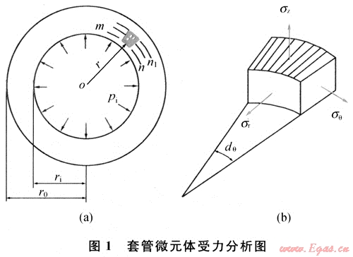 套管在井下情況的受力較為復雜,為了分析方便,主要考慮套管受內壓和外擠作用(即管內外壓差),而忽略軸向力和溫度對管柱應力的影響時,套管屬于中厚壁管(圖1)。