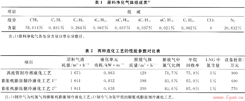 對比可知:①渦流管制冷器液化工藝的原料氣消耗量大于膨脹機膨脹制冷液化工藝,且有大部分冷氣作為循環(huán)氣,氣量為5080m3/h,即初始開車時系統(tǒng)中要多出5080m3/h的原料凈化氣(折合12120m3/d)。②渦流管制冷器液化工藝液化單元功耗高于膨脹機膨脹制冷液化工藝(尤其是當膨脹機膨脹制冷液化工藝采用氮甲烷制冷氣時,渦流管制冷器液化工藝液化單元功耗高出36%)。③渦流管制冷器液化工藝排放氣體中的氮含量大于膨脹機膨脹制冷液化工藝,甲烷的回收率低,導(dǎo)致其LNG中氮氣的含量較大,如果按照小于1%含氮量(摩爾分數(shù))的標準執(zhí)行,該工藝不能滿足脫氮要求。④從整個液化單元(包括原料氣壓縮、遇冷系統(tǒng)、循環(huán)氣壓縮)的設(shè)備投資來看,渦流管制冷器液化工藝由于要將氣體壓縮到20MPa,所需設(shè)備防爆等級較高,設(shè)備投資也約高出膨脹機膨脹制冷液化工藝15%。⑤但是渦流管制冷器液化工藝操作靈活,進入原料氣即可快速成液,生成LNG,這是其最大的優(yōu)越性。