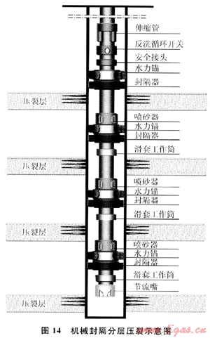 對于氣層多而薄,非均質(zhì)性強的儲層:采用了分層壓裂改造的儲層改造思路,實現(xiàn)了不動管柱一次分壓4層的技術(shù)突破(圖14)。通過114口探井的應用,平均試氣產(chǎn)量提高3.74×104m3/d,已成為蘇里格氣田勘探開發(fā)的主體技術(shù)之一。