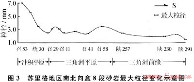 蘇里格地區(qū)主體處于三角洲平原、三角洲前緣沉積相帶。 中二疊世石盒子期盒8時,北部物源區(qū)進一步隆升[7],為盆地沉積提供了豐富的碎屑物質(zhì),古氣候由潮濕轉(zhuǎn)為半干旱干旱,受氣候季節(jié)性、周期性變化影響,湖平面頻繁波動,在平坦地形的情況下,湖岸線擺動大而且迅速,三角洲平原上的分流河道通過湖面的頻繁波動向湖泊中心方向長距離推進,形成高建設型河流三角洲沉積,且導致不同期次的河道橫向反復遷移,砂體縱向上多期疊置,平面上連片分布,主力氣層盒8段形成延伸范圍達數(shù)百千米大面積分布的砂巖儲集體。砂巖粒度總體表現(xiàn)為北粗南細、以中-粗粒為主的特征,北部沖積平原相砂巖最大粒徑達7.0mm,向南延伸的三角洲前緣相仍發(fā)育粗粒相砂巖,砂巖的最大粒徑達2.0mm(圖3)。