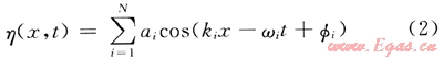 式中η(x,t)表示x處的水面相對于靜水面在t時刻的高度,m;ai為第i個組成波的波幅,m;ki表示t時刻在這個水面高度的波的數(shù)量,就是第i個組成波的數(shù)量;ωi表示第i個組成波的圓頻率,1/s;φi表示第i個組成波的初始相位,(°)。