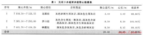元壩3井是中國石化南方勘探開發(fā)分公司部署的一口重點區(qū)域探井,完鉆井深7450m,在7000m以下二疊系龍?zhí)督M、茅口組、棲霞組Φ165.1mm小井眼中各取心一次,取心工具為川5-4取心筒,取心情況見表1。