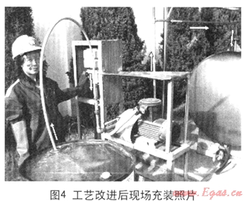 我們對(duì)加臭劑充裝工藝改進(jìn)后的效果進(jìn)行了評(píng)價(jià),發(fā)現(xiàn)最明顯的效果是大大縮短了加臭劑的充裝時(shí)間。將一桶加臭劑充裝到加臭機(jī)的儲(chǔ)液罐,改造前用氮?dú)鈮阂旱某溲b方式確需要2小時(shí),而現(xiàn)在用電機(jī)帶動(dòng)齒輪泵抽液的充裝方式僅需10分鐘就可完成。另外,由于采用常壓抽取,加臭劑原料桶和抽液管不承壓,減少了超壓變形、破損的可能;而且原料桶內(nèi)的加臭劑可以很干凈的充裝到儲(chǔ)液罐中,減少了浪費(fèi)。圖2為加臭劑充裝工藝改進(jìn)后現(xiàn)場(chǎng)充裝照片。